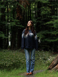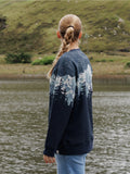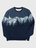 Blanketed by the deep blues of night, the Cascadian Night crewneck from Hapy Earth features a silhouetted forest nestled within a cascade of snow-capped mountains.