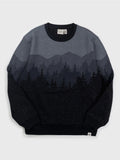 Achromatic blacks and grays create a moody nightscape of mountains and trees on this Happy Earth crewneck.