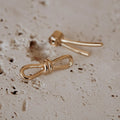 An adorable new twist on the trendy bow earrings. The ribbon tails hang from behind the earlobe making these a jacket earring style. The Bowie Stud Earrings have two pieces: the bow loop which pushes into the ear hole, and the ribbon tails which push into the pin from behind to close the earrings.