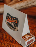 The entire design, both the cabin-shaped matchbox and the long matchsticks within, feels like a keepsake from a peaceful getaway in the woods—a miniature symbol of warmth, serenity, and the quiet beauty of nature.