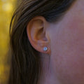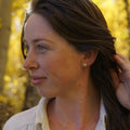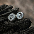 These solid silver mismatched Moon and Star stud earrings are the perfect everyday earring. Handmade in Colorado, each earring begins by melting recycled Argentium silver into a neat ball. It is then hammered flat, giving each earring its unique, organic shape. A solid .940 silver post is soldered onto each piece, followed by a hand-stamped crescent moon and shining North Star design. It is then darkened for detail, and polished to a beautiful finish. Once crafted, the earrings are matched into pairs and placed on a green tag with material information on the back and a hole on the top for easy displaying. Comes with hypoallergenic, sturdy silicone earring backs!