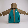 The rain jacket features a fitted hood and waterproof design, with a color block style and reflective details.