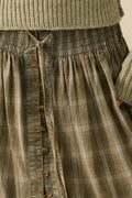 Rooted in charm and made for wandering, the Forest Folk Maxi Skirt is your go-to for slow mornings, forest paths, and wherever your fall-loving heart may roam. Made from soft 100% cotton in a rich pine-green plaid, it features a comfy smocked elastic waist with a drawstring (yes, pie seconds are welcome), wood buttons for that earthy touch, and a breezy front slit for a little movement magic. The ankle-grazing ruffle hem brings just the right amount of whimsy to your every step — barefoot or booted.