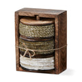 Wrapped around a mango wood spool and held by an antique pin. Set includes 3 different 180" rolls of ribbon.