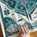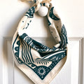 100% cotton bandana with original artwork by Land & She. Bandana color is a beautiful warm-white color with natural flecks and speckles with design printed in midnight teal ink. Measures approx. 21x21 inches.