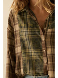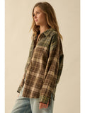 The Oak Street Flannel features: Colorblock design with contrasting plaids. Collared neckline. Button-front closure. Long sleeves with buttoned cuffs. Drop shoulder. Pleated yoke back. Curved shirttail hem with raw edge. Loose fit.